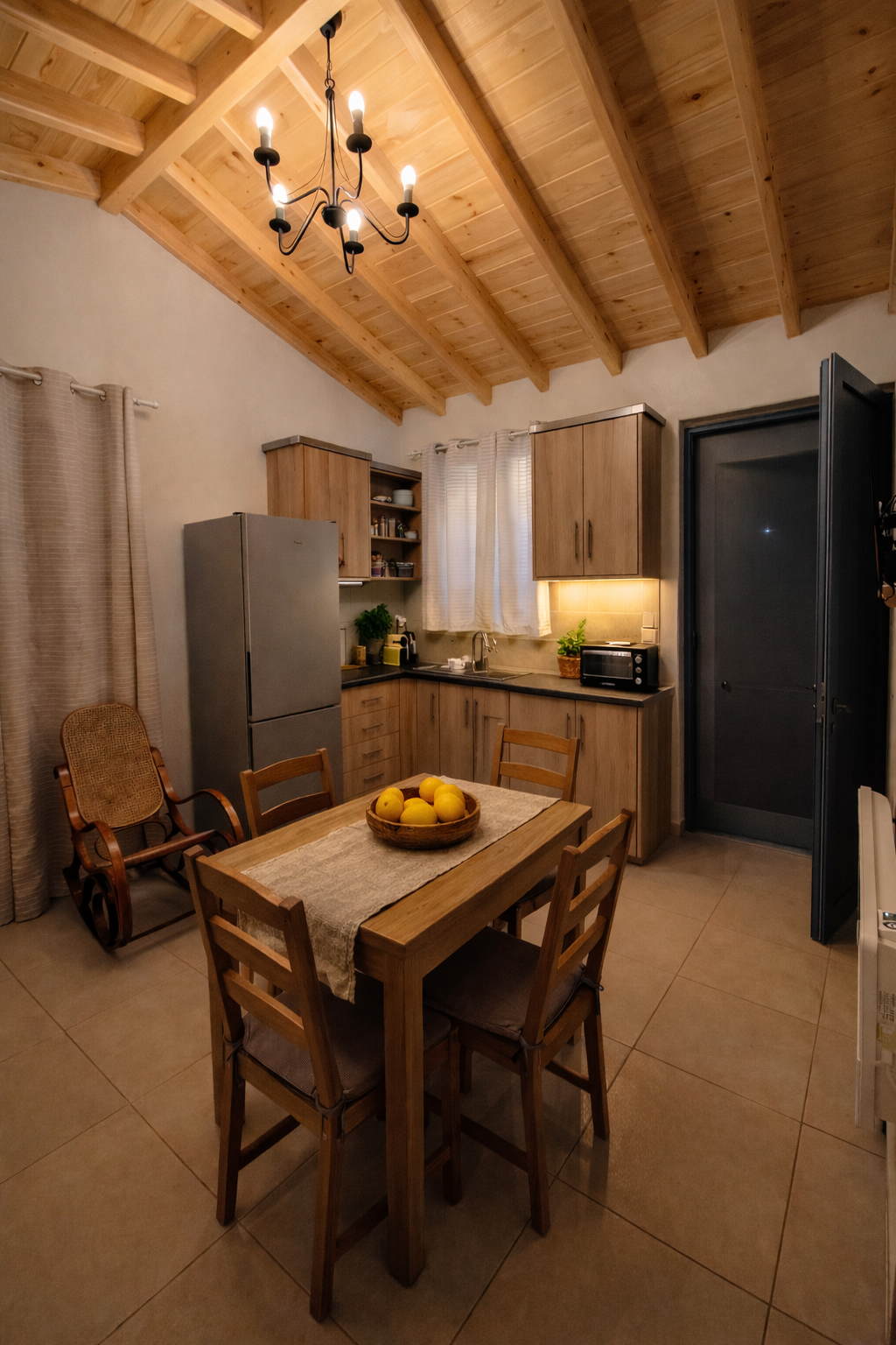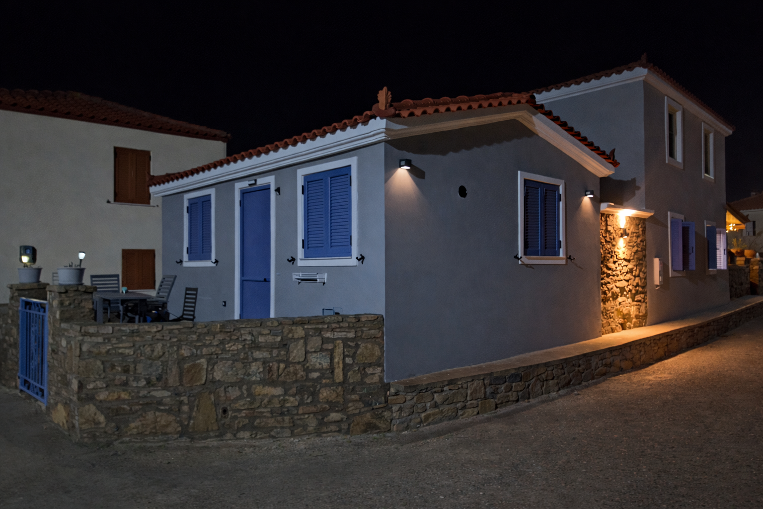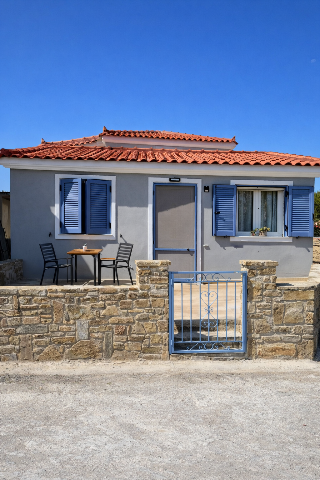 The kitchen is equipped with a coffee machine , kettle, and toaster, allowing you to prepare your meals and enjoy your holiday at your own pace. Outside, the private courtyard with outdoor seating and dining area provides the perfect setting for peaceful mornings and relaxed evenings in an authentic island atmosphere.
